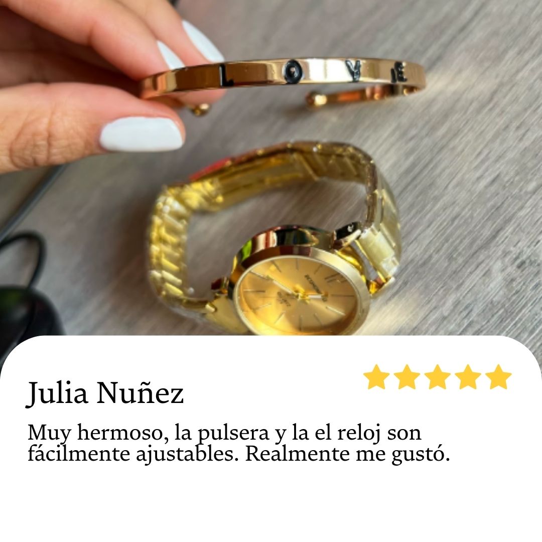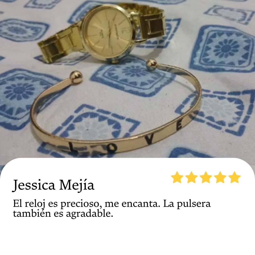 Mariana P. "Me encanta este set, el reloj es elegante y la pulsera le da un toque único. Perfecto para cualquier ocasión."