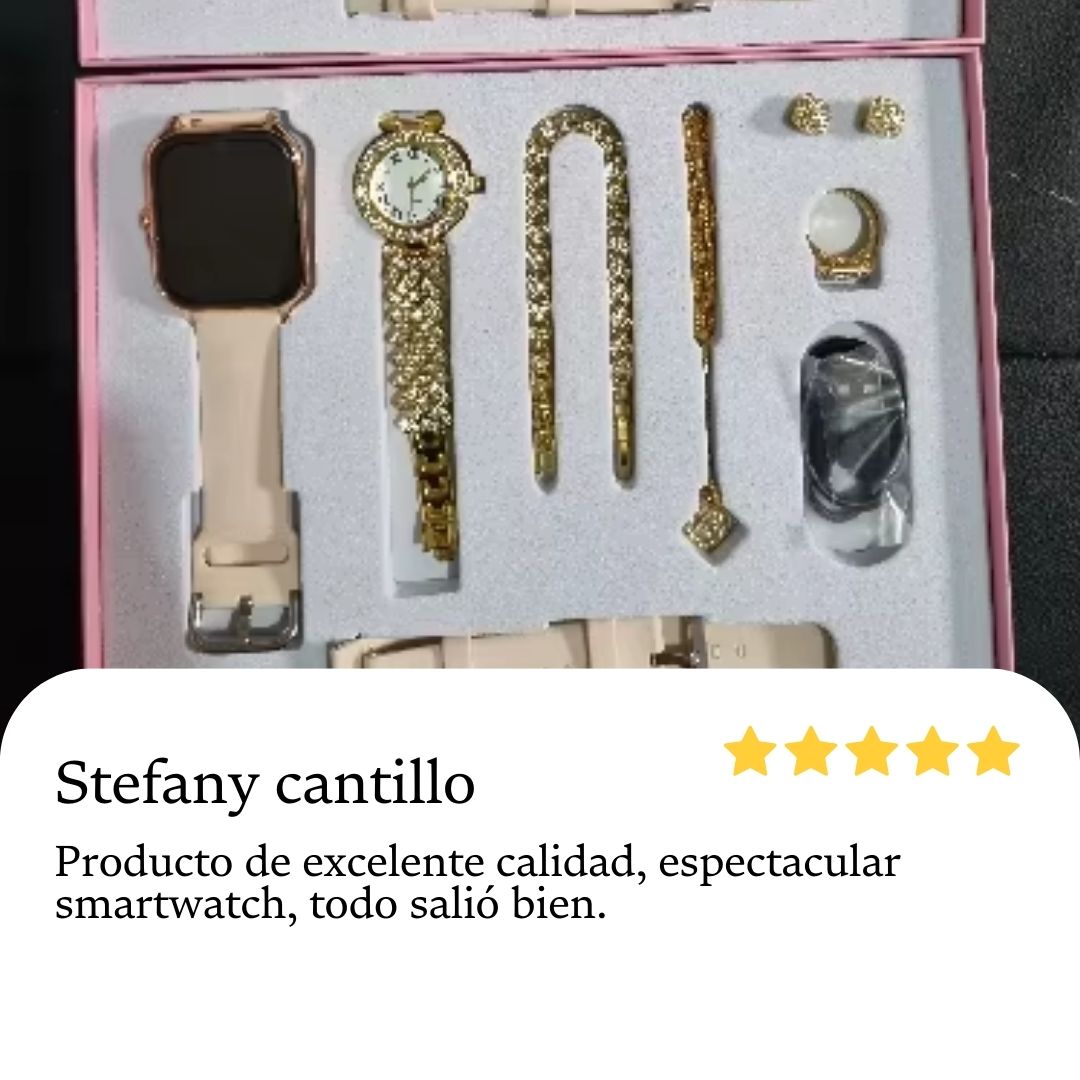 Javier Martínez: Este combo fue un regalo perfecto para mi esposa. Le encantó la calidad de las joyas y la funcionalidad del reloj inteligente. Ahora lo usa todo el tiempo.