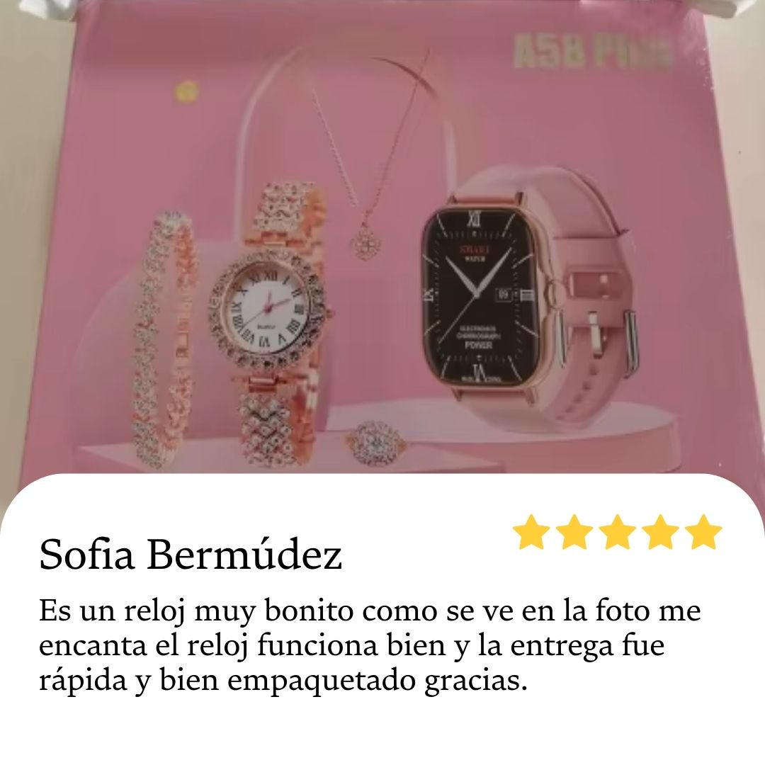 Carolina Pérez: Me encanta que tenga todo en un solo paquete. El reloj inteligente es elegante y fácil de usar, y los aretes y la pulsera son un complemento ideal.