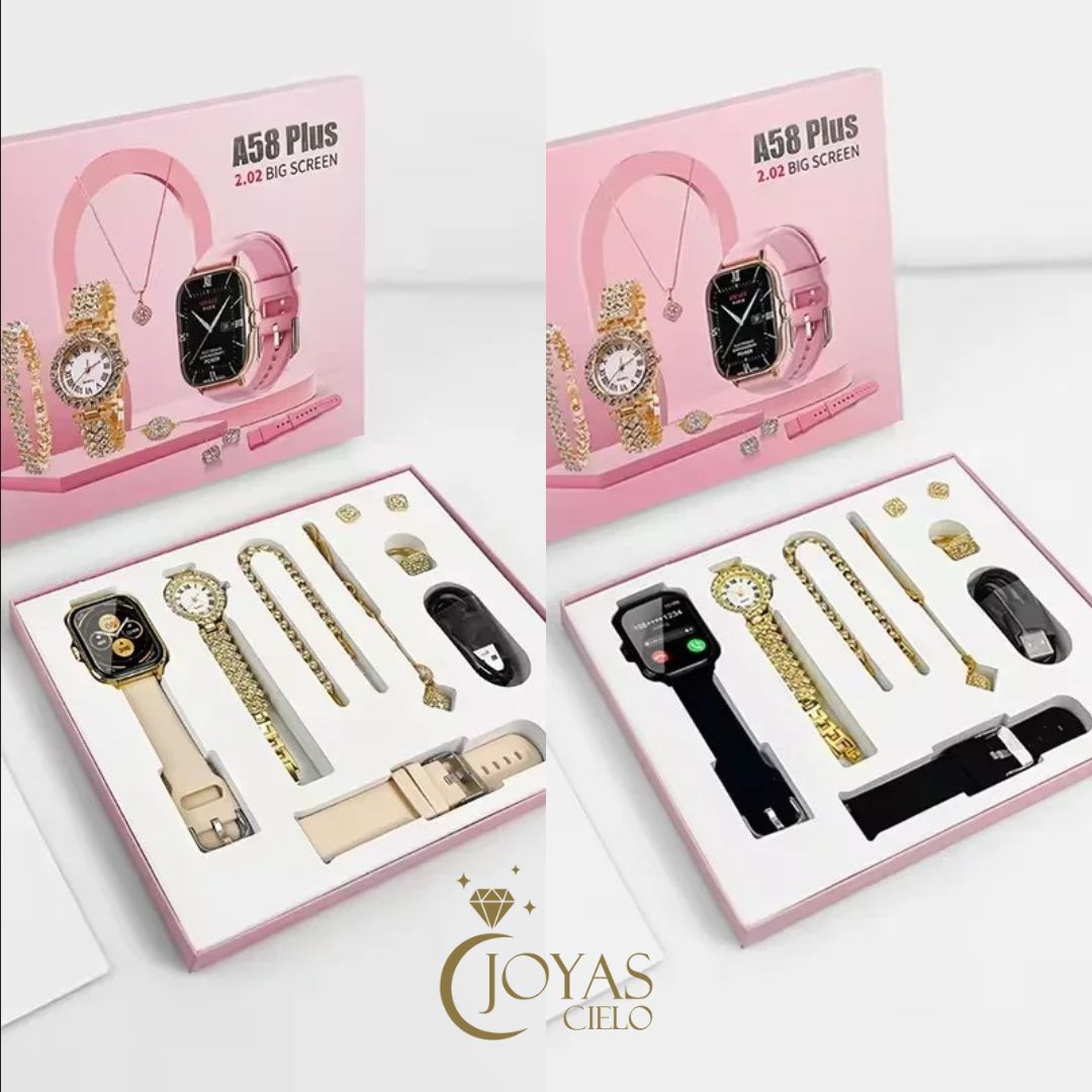 Funcionalidad: Este set incluye un reloj inteligente con funciones avanzadas como llamadas, configuración de idioma y estilos personalizables, junto con un reloj clásico que aporta elegancia intemporal.
