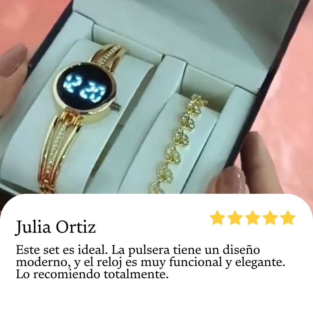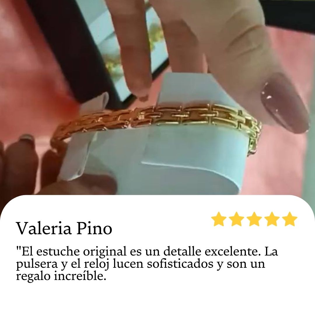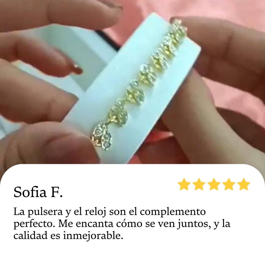 María F.: "Lo que más me gusta es cómo el set de reloj y pulsera complementa mi estilo. Elegante y sofisticado, definitivamente lo recomiendo."